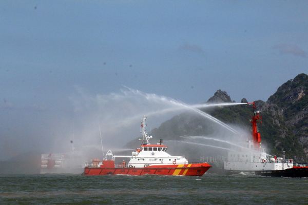 Diễn tập phối hợp tìm kiếm cứu nạn hàng hải trong vùng nước cảng biển Kiên Giang.Ảnh: Lê Sen - TTXVN