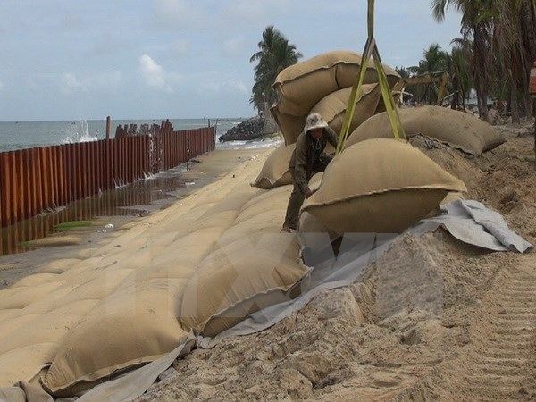 Xếp bao tải cát thành chân khay vào mái đê chống sạt lở bờ biển Cửa Đại. (Ảnh: Hữu Trung/TTXVN)